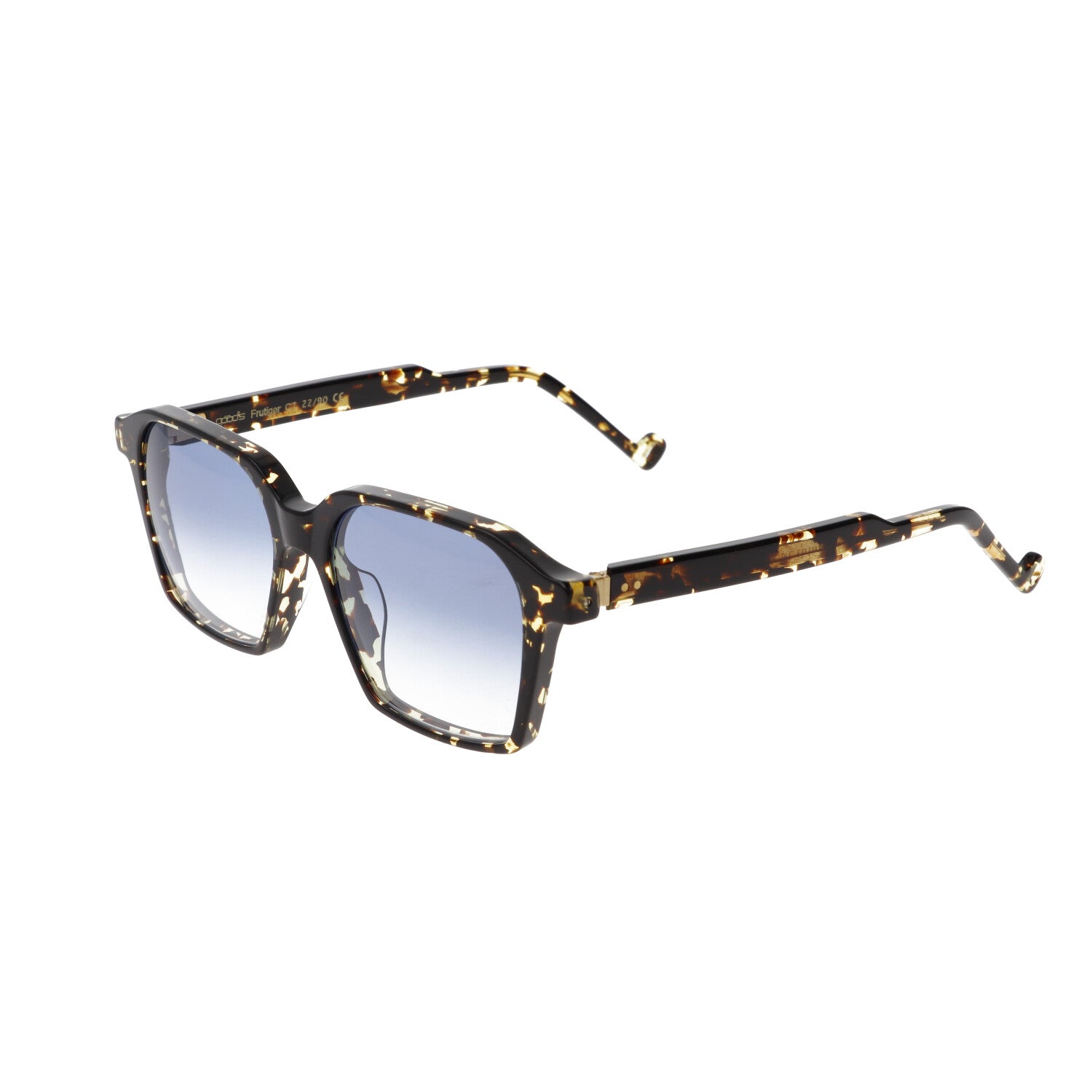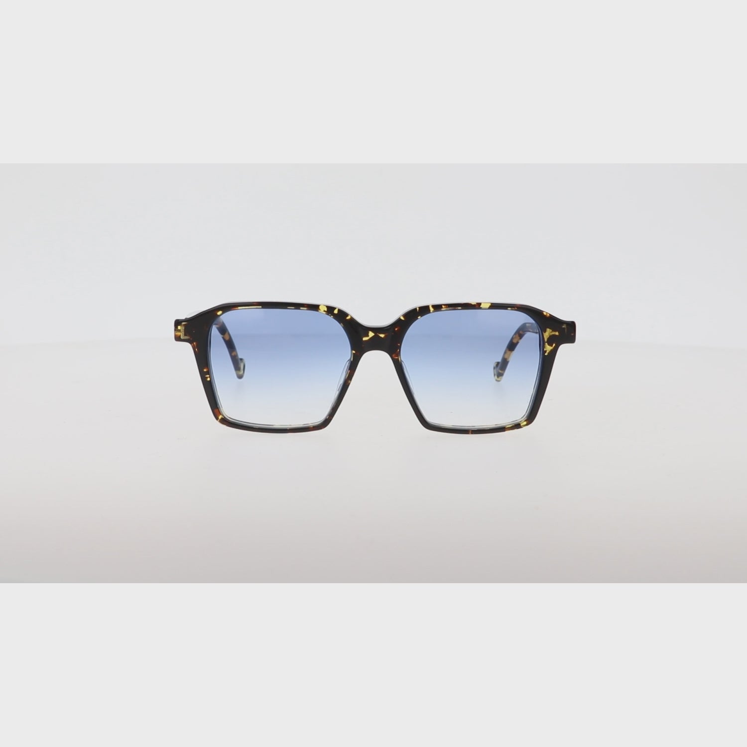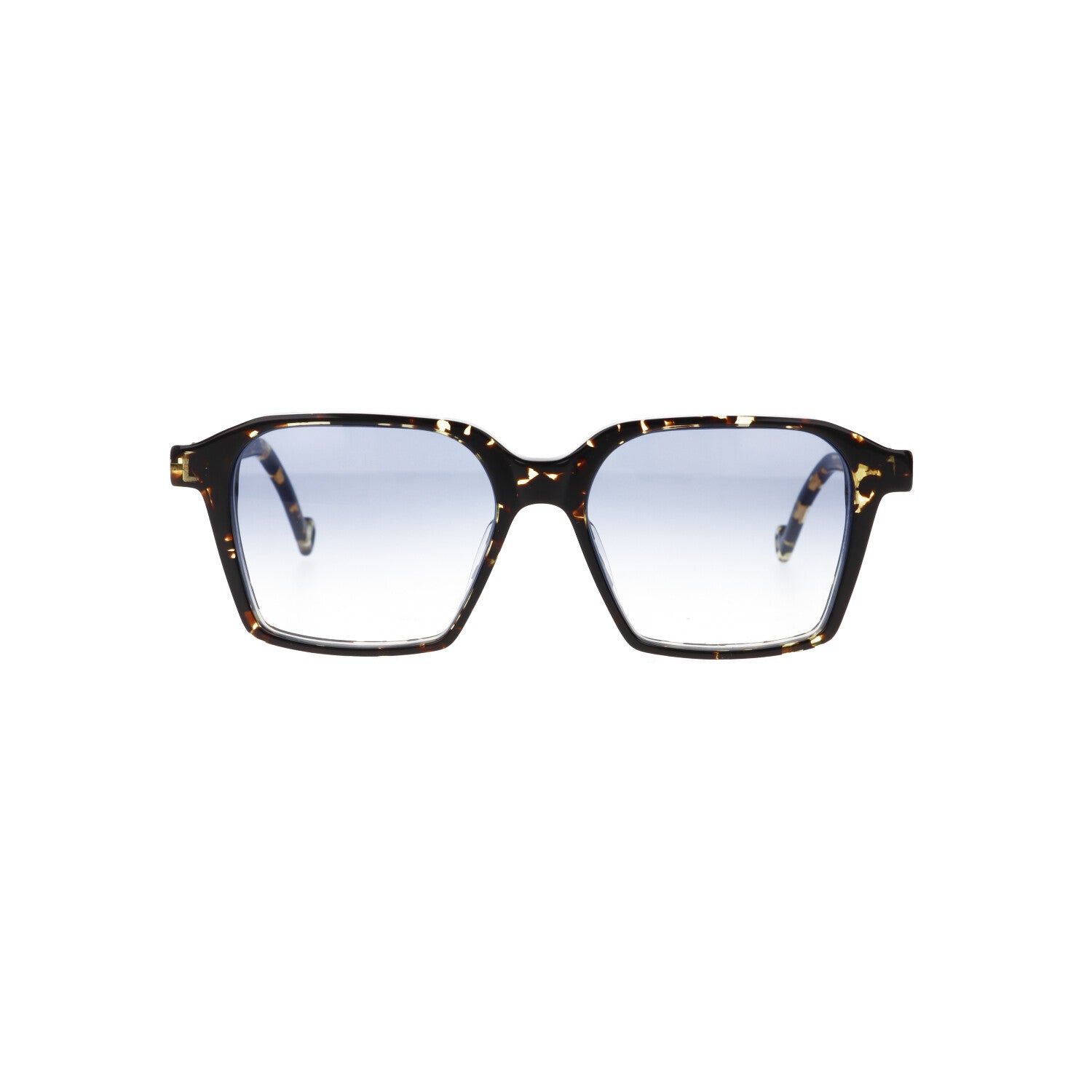 Frame front: The frame front reproduces the original font design in proportion to the thicknesses between the relatively homogeneous horizontal and vertical temples and the inclination of the ascending and descending temples. The resulting frame has a delicately retro-futuristic taste, linear but not lacking