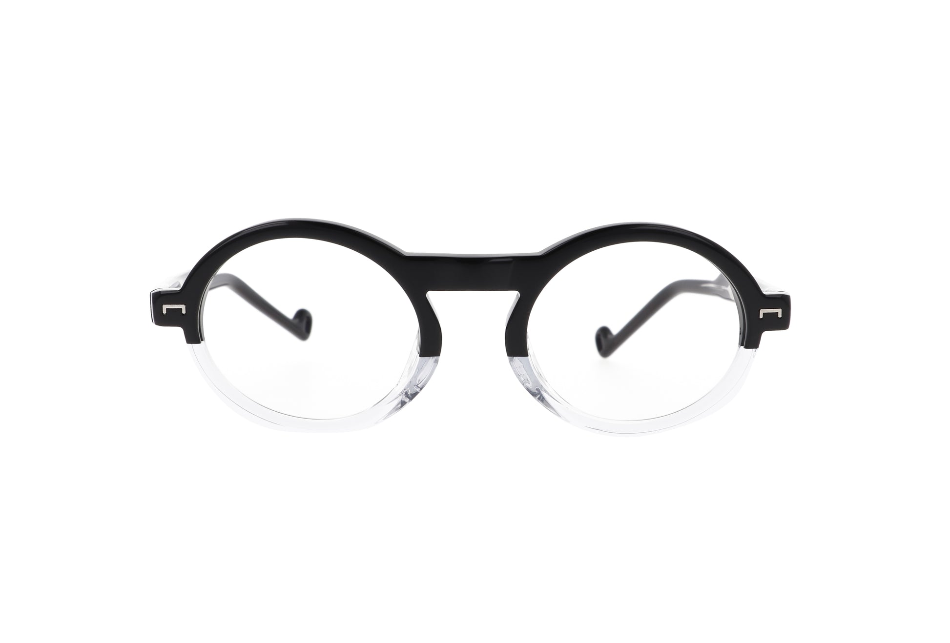 FRONT FRAME: the two oval lenses are connected by a perfectly horizontal bridge, under which straight slanting lines and winding bends interact.